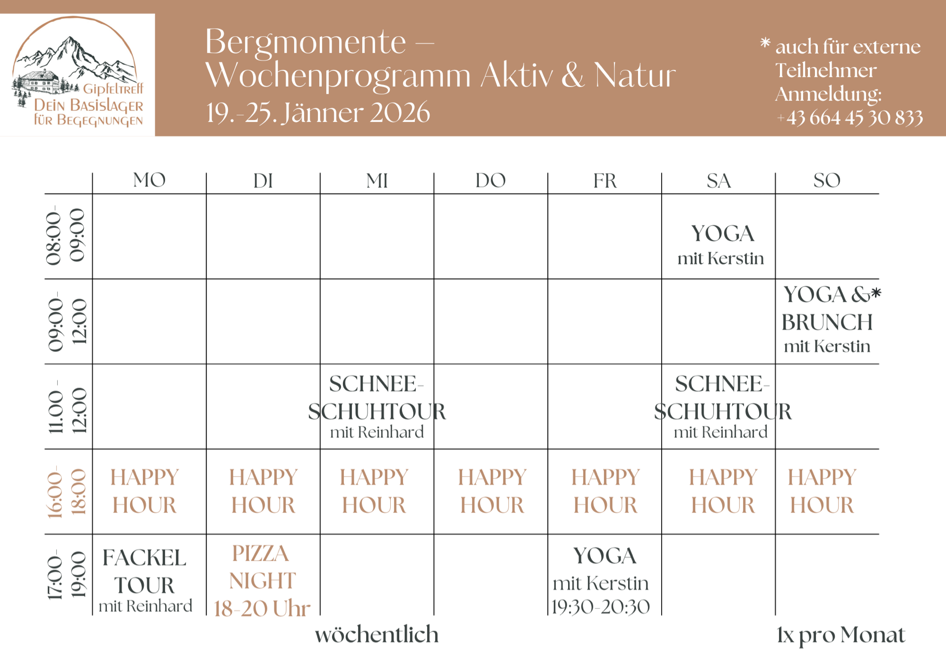 Unser Programm vereint sportliche Herausforderungen, Naturmomente und Bergerlebnisse. Von Winterwanderungen über Schneeschuhtouren bis zu entspannten Yogaeinheiten – hier erlebst du den Winter intensiv, abwechslungsreich und persönlich.