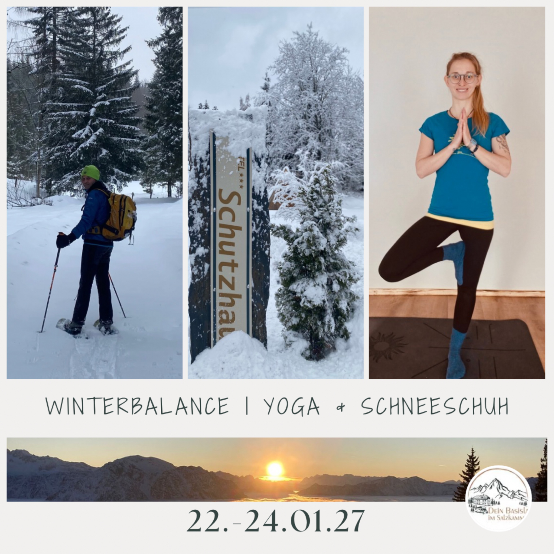 voller Yoga, Schneeschuhwanderung, Wintermomente in der Natur und Entspannung im wunderschönen Salzkammergut.